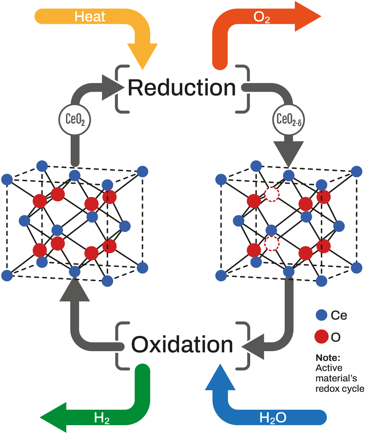 A key aspect that distinguishes this method from others is the rapid and brief sequence of redox (reduction-oxidation) cycles. In the first half-reaction, the active material (currently CeO2) is reduced by absorbing heat and releases oxygen. Subsequently, in the second half-reaction, the reduced material reacts with vapor to oxidize again, resulting in hydrogen production.