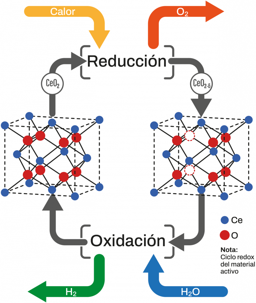 Un aspecto clave que distingue este método de otros es la secuencia rápida y breve de ciclos redox (reducción-oxidación). En la primera semirreacción, el material activo (actualmente CeO2) se reduce al absorber calor y libera oxígeno. Posteriormente, en la segunda semirreacción, el material reducido reacciona con el vapor para oxidarse de nuevo, lo que finalmente produce hidrógeno de gran pureza.